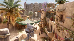 Graphiquement, Assassin’s Creed : Mirage brille par son souci du détail. La ville de Bagdad est somptueuse, avec une direction artistique qui capte parfaitement l’essence de l’époque. Les jeux de lumière, particulièrement à l’aube et au crépuscule, créent des ambiances immersives, tandis que les textures des bâtiments et les animations des personnages principaux sont très réussis. Les détails comme les vêtements des personnages ou la végétation urbaine ajoutent à l’immersion globale.