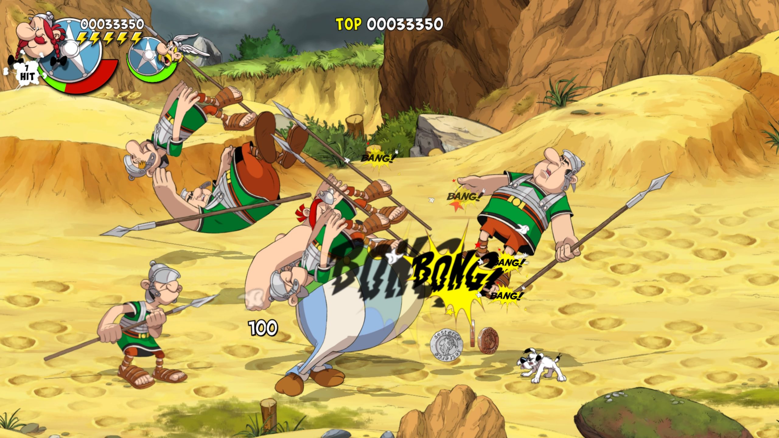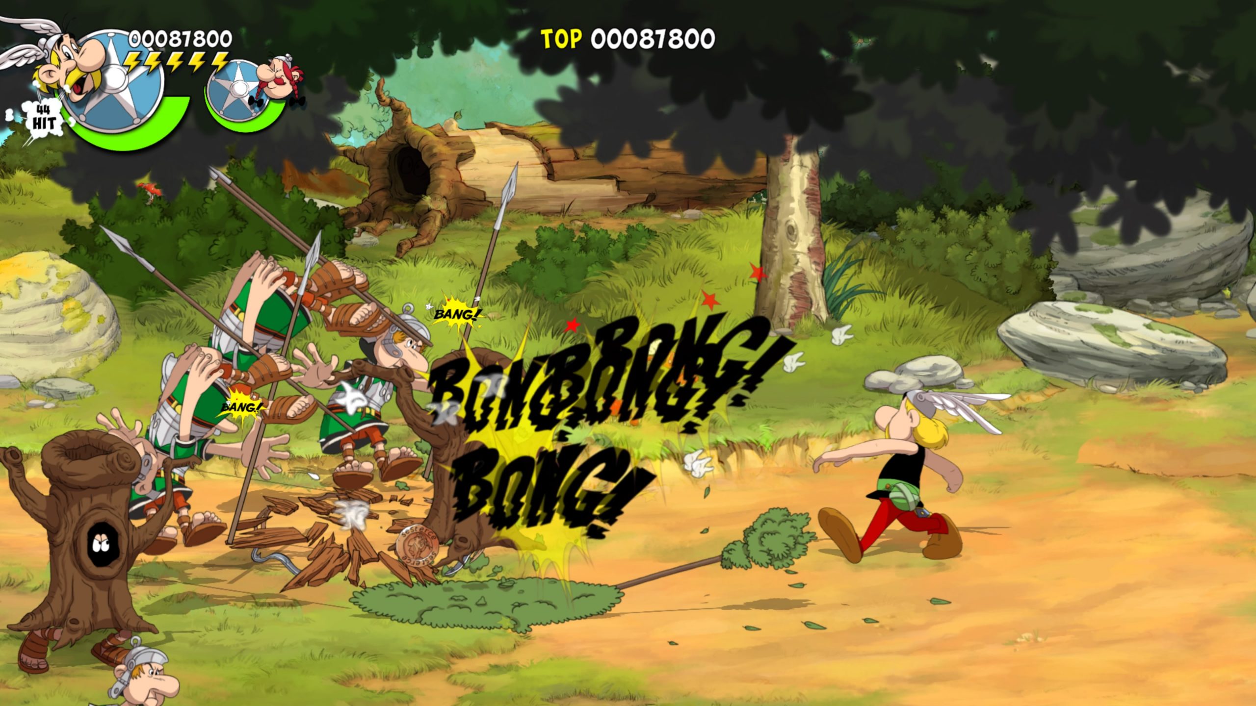 Pas de réelles surprises, mais une jolie nostalgie. On retrouve nos chers Gaulois dans des aventures déjà connues du public : chez les Normands, les Corses, les Bretons, etc. Le jeu se divise en six actes entrecoupés par des mini-jeux sans grande originalité. Dans les niveaux, on commence avec soit Astérix, soit Obélix (ou les deux si on joue en coop) mais on peut alterner à n’importe quel moment. Puis, c’est parti pour baffer tout ce qu’on croise : romains, brigands, pirates, gladiateurs et même taureau ! Il s’agit d’un beat’em up à l’ancienne à la manière d’un Streets of Rage : on marche dans un couloir en vue 2D, façon Metroid Dread, et une flèche *GO!* nous indique quand on peut reprendre la route une fois tous les ennemis vaincus. Et une fois le niveau terminé, on comptabilise les points. Le jeu respecte correctement cette règle et promet de raviver des souvenirs aux afficionados du style vidéoludique.