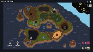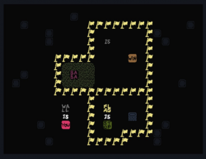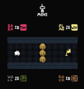 Baba Is You est un jeu de réflexion avec un système très simple : Toutes les règles sont visibles sur l’écran, elles ont toutes une logique du type WALL IS STOP ou FLAG IS WIN, la première fait en sorte que vous ne puissiez pas passer à travers un mur, la seconde fait que vous gagnez si vous arrivez à atteindre le drapeau. Simple.